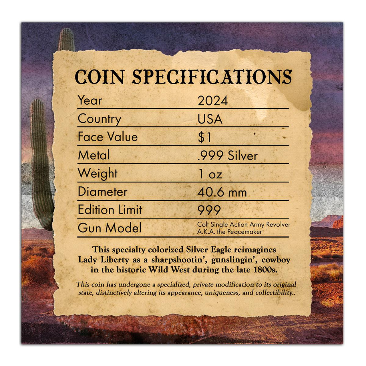 Lady Liberty in Arms Series II imagines Lady Liberty in various situations where guns are used in America. This second issue takes Lady Liberty back to the late 1800s as a cowboy in the Wild West, earning an honest living on the new frontier. The obverse features Adolph A. Weinman's Lady Liberty walking through a classic Wild West town wearing iconic cowboy attire. She carries a Colt Single Action Army Revolver, also known as The Peacemaker. This gun was a popular piece during that era, as it was commonly used by ranchers, lawmen, and outlaws alike. The Peacemaker was a common thread between men from all walks of life in the new frontier of the Wild West. The reverse design shows a breathtaking landscape of a cactus in the desert that is commonly associated with the Wild West to this day behind Emily Damstra's stunning Landing Eagle design.