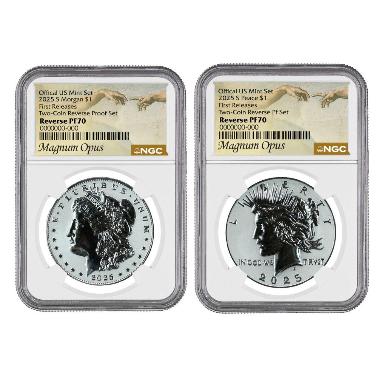 2025-S Reverse Proof Morgan & Peace Dollar Set – Magnum Opus Label NGC Reverse PF70 First Releases